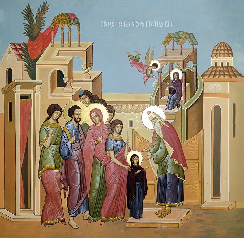 Когда Деве Марии исполнилось три года, благочестивые родители Ее приготовились исполнить свой обет Богу. Они созвали родственников, пригласили сверстниц своей Дочери, одели Ее в лучшие одежды и, провожаемые народом с пением духовных песен, повели Ее в храм Иерусалимский для посвящения Богу. Ее подруги-сверстницы, как и Сама Мария, шли с зажженными свечами в руках. Навстречу им вышли из храма священники во главе с первосвященником. Иоаким и Анна поставили Марию на первую ступень лестницы, ведущей в храм. Лестница же эта имела пятнадцать больших ступеней по числу псалмов, которые священники пели при входе в храм. И вот трехлетняя Мария без всякой посторонней помощи взошла по высоким ступеням. Там первосвященник встретил и благословил Ее, как это он всегда делал со всеми посвящаемыми Богу. А затем по внушению Духа Святого он ввел Ее во Святое Святых. Это было самое священное место в храме. Туда никто не имел права входить, кроме первосвященника и то только один раз в год. Дух Святой внушил первосвященнику, что Мария – избранная Богом, поэтому достойна входить в самое священное место. Ей предназначено стать Матерью Сына Божия, который откроет людям вход в Царство Небесное. Иоаким и Анна, исполнив свой обет, возвратились домой, а Мария осталась жить при храме. Там она вместе с другими девочками обучалась Закону Божию и рукоделию; много молилась, читала Священное Писание и строго соблюдала пост. При храме Божием Пресвятая Мария жила около одиннадцати лет и выросла глубоко благочестивой, во всем покорной Богу, необычайно скромной и трудолюбивой. Пресвятая Мария решила посвятить всю свою жизнь только одному Богу. Для этого Она дала обет никогда не выходить замуж, т.е. навсегда остаться Девой. Дух Божий и Святые Ангелы охраняли Божественную Деву. Нужно помнить, что наше спасение, наше искупление воплотившимся Сыном Божиим стало возможно потому, что избранная послужить для этого Пречистая Богородица была введена своими родителями в храм Божий и получила воспитание при храме. Этот поступок родителей Марии церковь ставит в пример всем верующим, указывая, что истинные христиане должны воспитывать в своих детях любовь к Всевышнему с самого раннего возраста, как только ребенок начинает понимать окружающее.